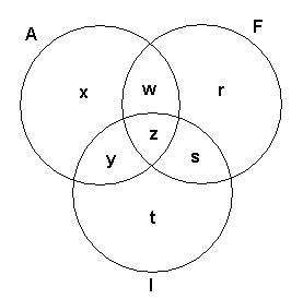 Veja a figura a seguir, onde x, y, z, w, r, s e t  representam número de elementos, sendo A, F e I os conjuntos daqueles que estão matriculados nos cursos de Alemão, Francês e Inglês respectivamente: