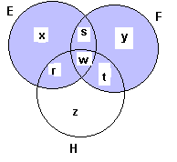 Veja a figura a seguir, onde x, y, z, w, r, s e t representam número de elementos, sendo E, F e H os conjuntos de brinquedos de Eduardo, Felipe e Hugo, respectivamente, onde: